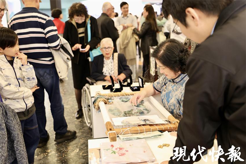 这一情形发生在德国斯图加特9月18日举办的“文明遇·鉴:我国民乐江苏周”暨“大运河遇见莱茵河”主题展览现场。来自江苏的非遗项目——南京云锦、十竹斋笺谱刻印、宜兴紫砂、无锡精微绣、金坛刻纸、扬州漆器、民乐扮演、二胡制造项目展台前,被德国观众围得风雨不透,我们抢先观看体会这些来自东方的奇特技艺。