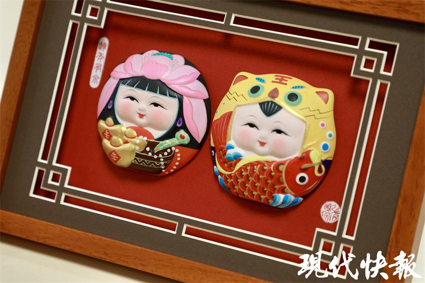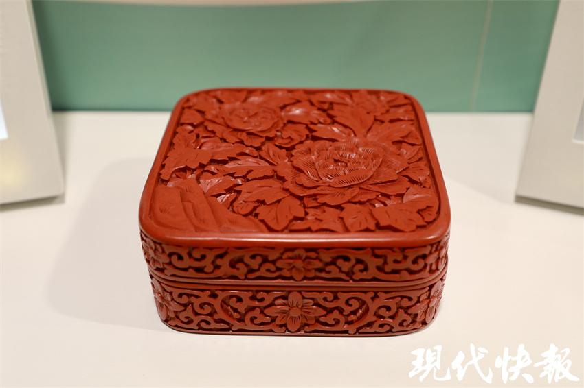 朱红色的扬州漆器著作分外引人瞩目。铸漆龙圆盘选用扬州铸漆工艺精制而成,画面以龙为主,雕漆方形盒选用扬州传统雕漆工艺制造而成,主体画面以牡丹花为主。现场观众既感叹著作的精美,也被漆器著作背面的匠心信服。